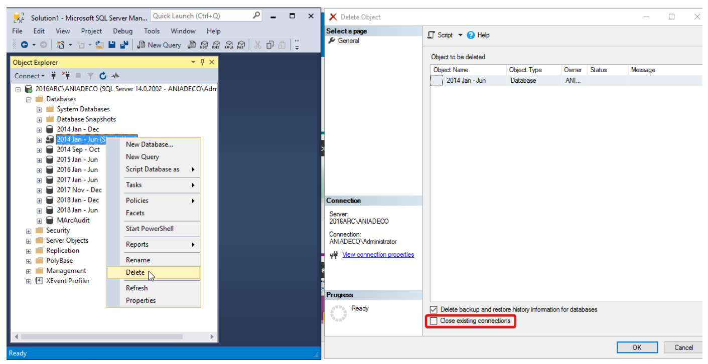 Right-click the respective store and use the Delete option. A new window pops up and confirms the object deletion. It is recommended to check the Close existing connections option to prevent SQL Management studio from hanging.