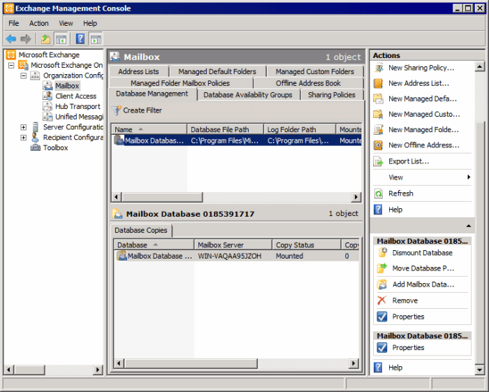 Go to Microsoft Exchange > Organization Configuration > Mailbox node. Right-click the Mailbox database and choose Properties.