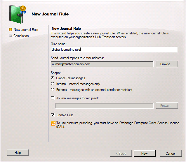 Scope - Choose whether to journal all emails (Global), internal or external email.